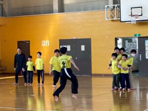 はじめに、六年生による木刀の演武が披露され、その後稽古がスタート。
